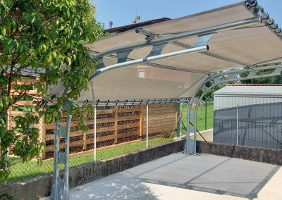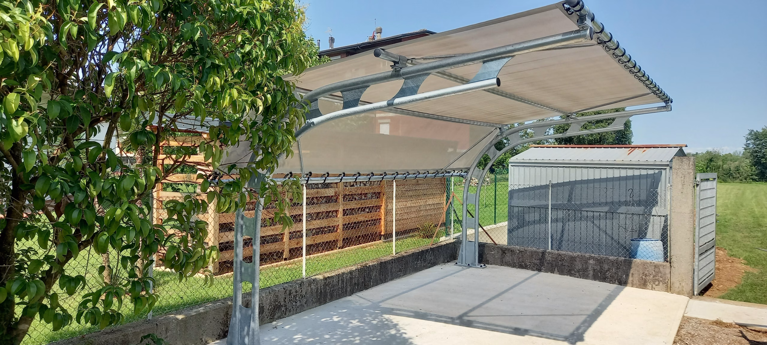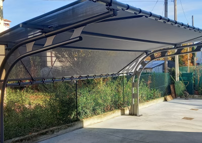 Struttura metallica in acciaio zincato a caldo con copertura permeabile in tessuto ombreggiante/antigrandine spalmato pvc.